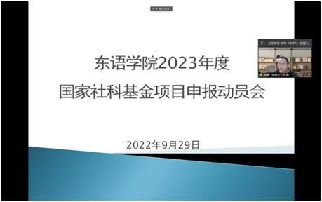 (刘艺苑/文)为切实做好东语学院2023年度国家社科基金项目申报工作,提高申报质量,9月29日晚,东语学院召开线上国家基金项目申报动员大会,东语学院院长王琪、副院长郑杨及学院部分教师参加会议,会议由郑杨主持。