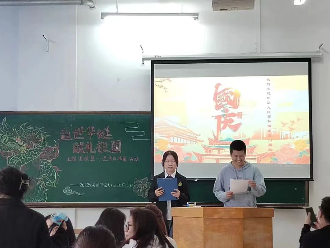 为庆祝中华人民共和国成立73周年,大力弘扬爱国主义精神,深入开展新生理想信念教育,同时帮助2022级新生尽快适应大学生活,增进同学们之间的交往和交流,建设良好和谐的人际关系。西语学院团委联合西语学院心理健康教育中心于10月2日下午深入各新生班级,开展“盛世华诞,献礼祖国”主题团课暨心理团体辅导活动。