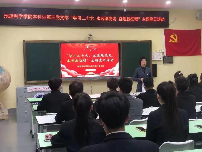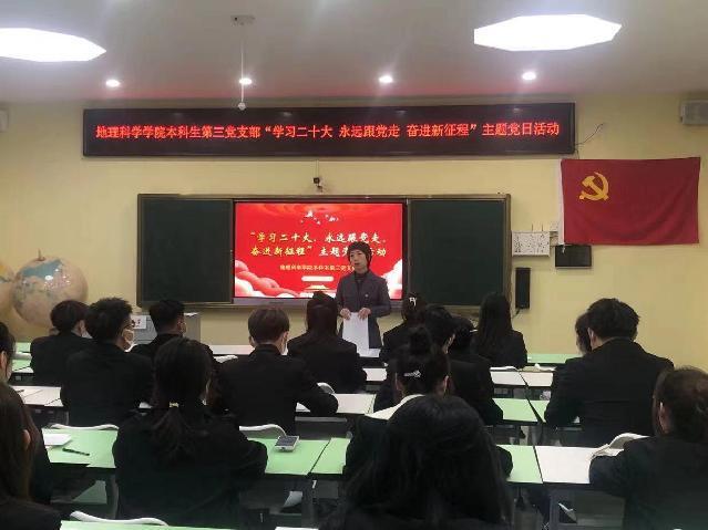 锦绣中华山河好,接续奋斗再扬帆。本次主题党日活动营造了学习党的二十大的良好氛围,地理科学学院各基层党支部将以饱满的政治热情,认真学习领会党的二十大精神,牢牢把握学生党建在育人工作中的重要抓手作用,引导广大学生党员将理论学习成果持续转化为提升党性修养、思想境界、道德水平的精神营养,踔厉奋发、勇毅前行,在民族复兴的伟大征程中激荡青春力量,在新时代浪潮中续写崭新奋斗篇章!