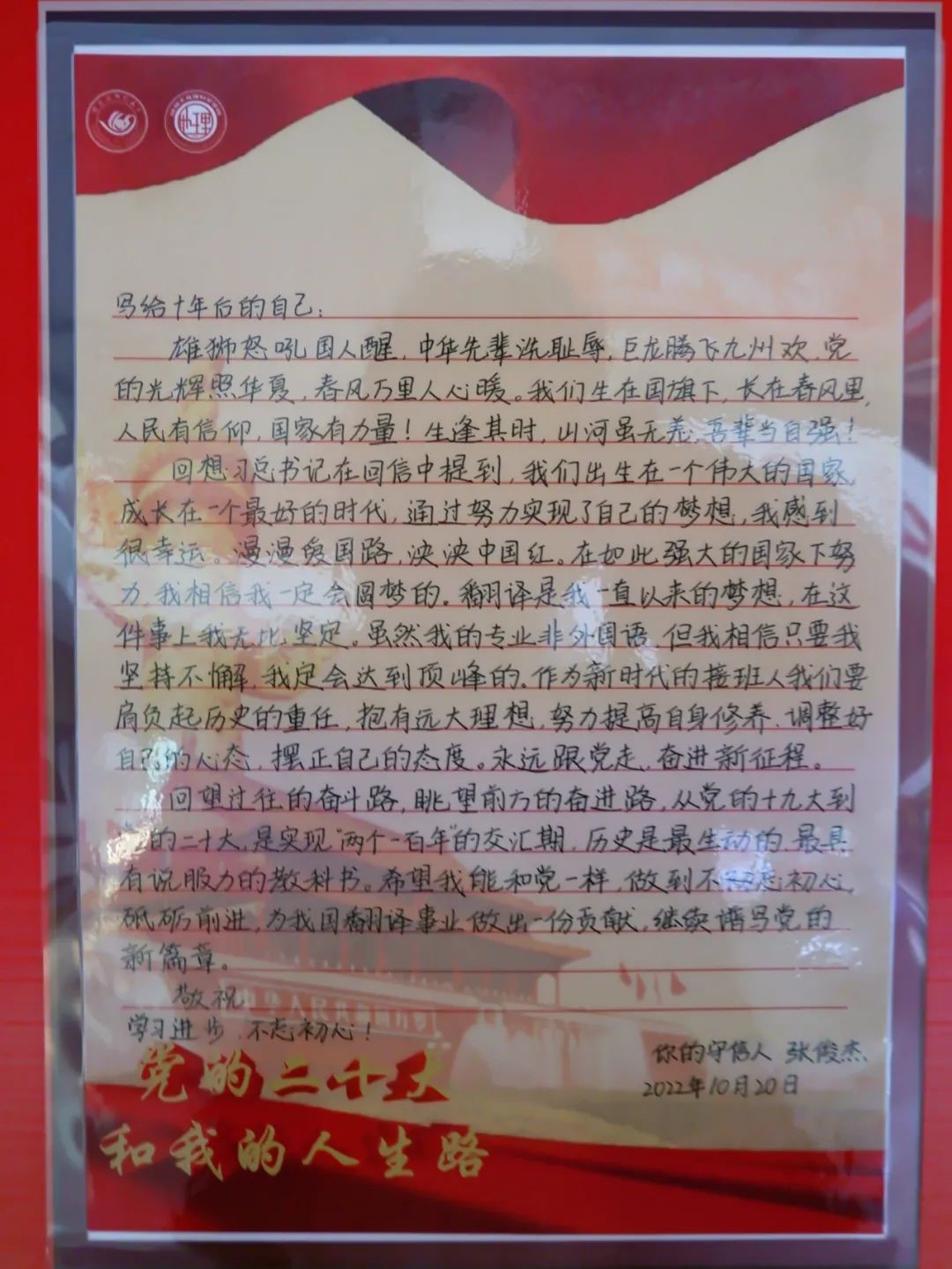 蓝图昭示未来,信念引领方向。为提升我院青年学生的信念感与使命感,引领广大青年学生牢记总书记的教诲,传承红色基因,坚定不移听党话、感党恩、跟党走,立志做有理想、敢担当、能吃苦、肯奋斗的新时代好青年,地理科学学院于10月20日晚19:00在理工三122室开展“党的二十大和我的人生路——以党的二十大总书记青年寄语为镜写给十年后的我”主题活动,2022级同学参与。