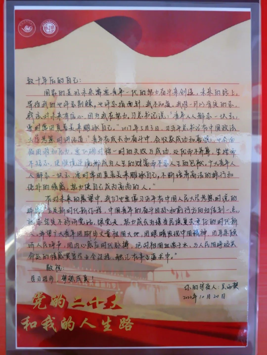 书信是通往心灵的快速列车,在书写信件的过程中,同学们可以慢下来,静静沉淀和思索,真实表达内心的声音。本次活动在让同学们深入学习领会党的二十大精神的同时,深切地感受到提笔写信的仪式感以及流淌在文字间的纸短情长,也为大家提供了一个记录成长、感受变化、表达感情的方式,有助于同学们释放压力、收获快乐、体会心灵感悟,积极面对生活。