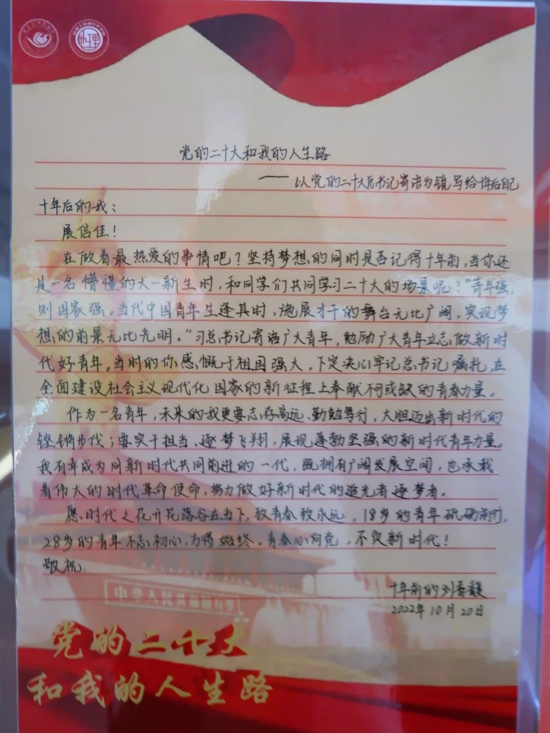 活动伊始,同学们共同观看了习近平总书记在党的二十大报告中殷切寄语青年的视频片段,回顾了习近平总书记对新时代青年的殷切期望。同学们心潮澎湃,立志要做“有理想,敢担当,能吃苦”的新时代好青年。随后,由工作人员下发信封、信纸,同学们豪情满怀,在信纸上书写感想,展望未来,一封封饱含情意的信寄托着对自己未来的期待与希望。最后,同学们将信件投入信箱,完成投递,等待着2023年10月1日的开箱仪式,再来回顾一年的成长与收获。