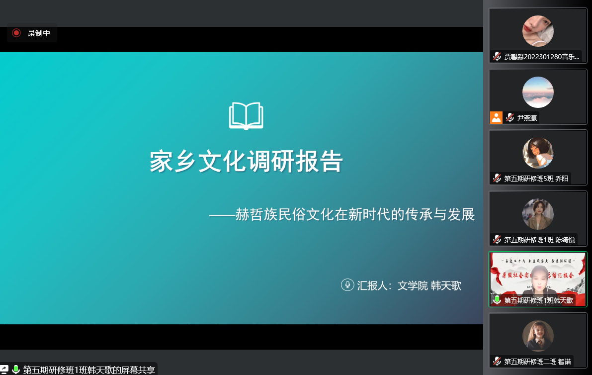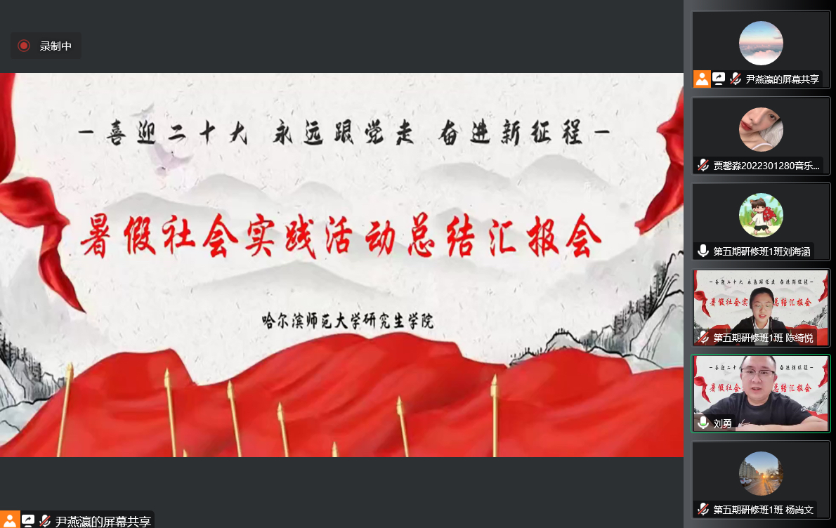 刘勇宣读了2022年暑假社会实践获奖作品名单。研修班成员代表高子贻、李梓源、吕沐阳等7位同学分别从模范人物寻访、志愿公益服务、家乡发展调研、少数民族文化等方面对暑假社会实践活动做了总结汇报。暑假社会实践活动增强了研究生服务社会的责任感与使命感,彰显了我校研究生的责任担当与青春力量,鼓励广大研究生同学继续在新征程上唱响青春之歌,在社会实践中砥砺奋进,谱写新时代青年服务人民、奉献社会的新篇章,用实际行动践行新使命。