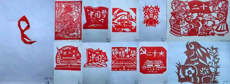 当明艳的中国红映入眼帘,闪烁着的是同学们坚定的目光,一张红纸、一把剪刀、一双巧手,落笔即巧思,巧手寄深情。同学们拿着红纸兴致勃勃地开始剪裁,纸张折叠翻转,剪刀起落,鲜艳的红纸跃动在同学们指尖,一幅幅栩栩如生、惟妙惟肖的作品就跃然纸上。当一幅幅栩栩如生的作品在桌上整齐排列,绘制出的是时代青年永远心向党的赤诚之心。