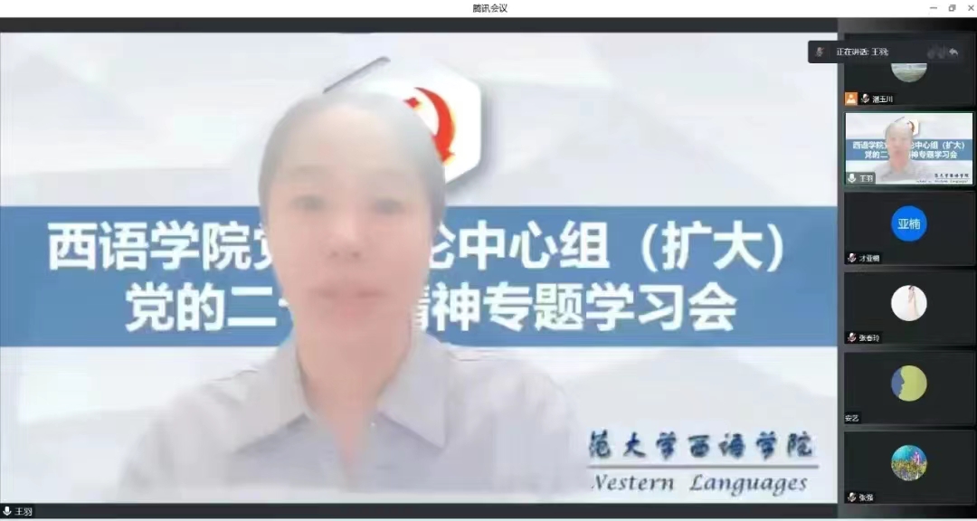 (张国燕/文)为深入学习宣传贯彻党的二十大精神,全面贯彻习近平新时代中国特色社会主义思想,西语学院党委理论学习中心组于2022年11月4日15:00通过腾讯会议举行学习宣传贯彻党的二十大精神(扩大)学习会,中心组全体成员及西语学院全体党支部书记参加会议,党委书记王羽主持学习并作中心发言。