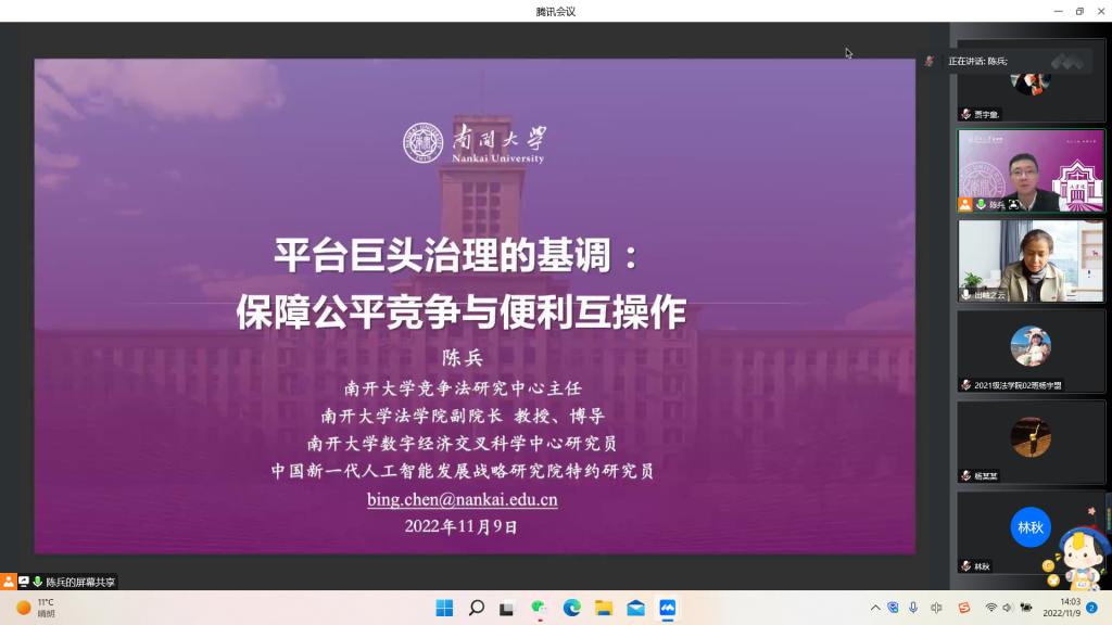 (孙振轩/文)为加强学科建设,促进专业文化交流,拓宽学生视野,提升理论水平,2022年11月9日14时,南开大学法学院副院长、博士生导师陈兵教授应邀做客法学院“梦溪法律讲坛”,以线上形式为我院师生带来了一场题为“平台巨头治理的基调:保障公平竞争与便利互操作”的精彩讲座。讲座由院长白云主持,学院部分教师及全体研究生、本科生参加。