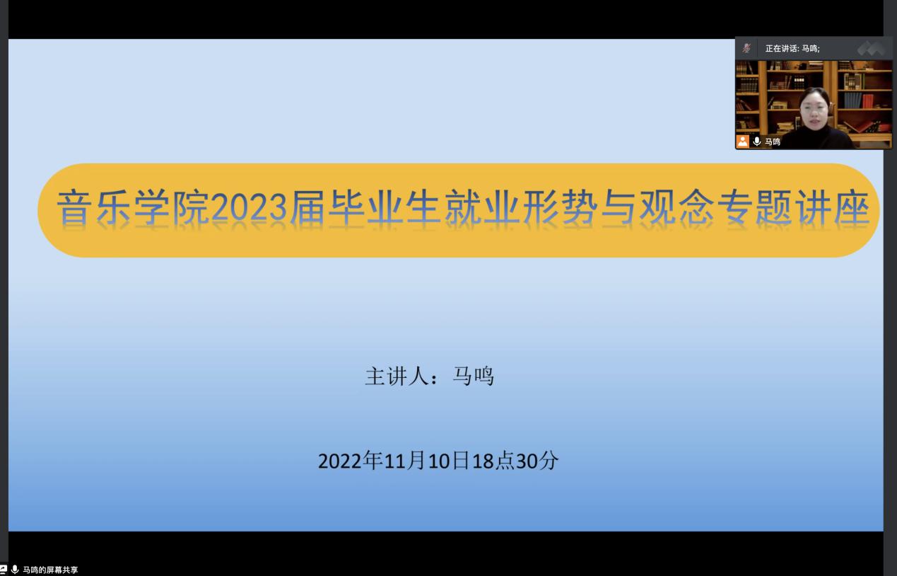 (吕珈境/图文)为贯彻落实习近平总书记关于教育的重要论述精神,加强高校立德树人根本任务,深入推进我校关于大学生就业的相关文件精神,音乐学院于11月10日在线上举办了《就业形势与观念专题讲座》,为2023届毕业生进行就业指导。讲座由学院团委书记马鸣主讲。