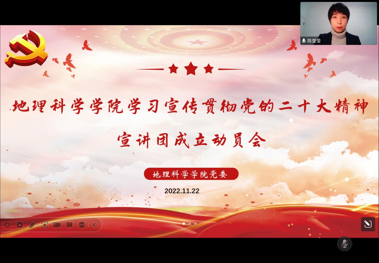 为深入学习贯彻宣传党的二十大精神,2022年11月22日晚,地理科学学院学习宣传贯彻党的二十大精神宣讲团成立动员会以腾讯会议的形式在线上举行。地理科学学院党委书记张立辉、院长张冬有、党政领导班子全体成员、各党支部书记、全体辅导员及宣讲团成员参加本次会议,会议由党委副书记陈莹莹主持。