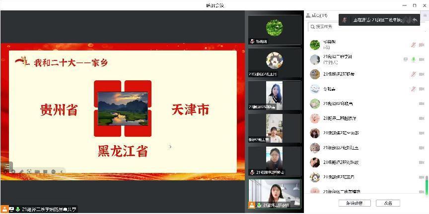 第二个环节是“我和二十大”。来自贵州、天津、黑龙江三省16市的同学们通过PPT展示了代表家乡发展变化的照片和视频,向同学们讲解了家乡近几年在党的领导下,在经济发展、交通建设、民生保障和脱贫攻坚等方面发生的变化和取得的重大成就。