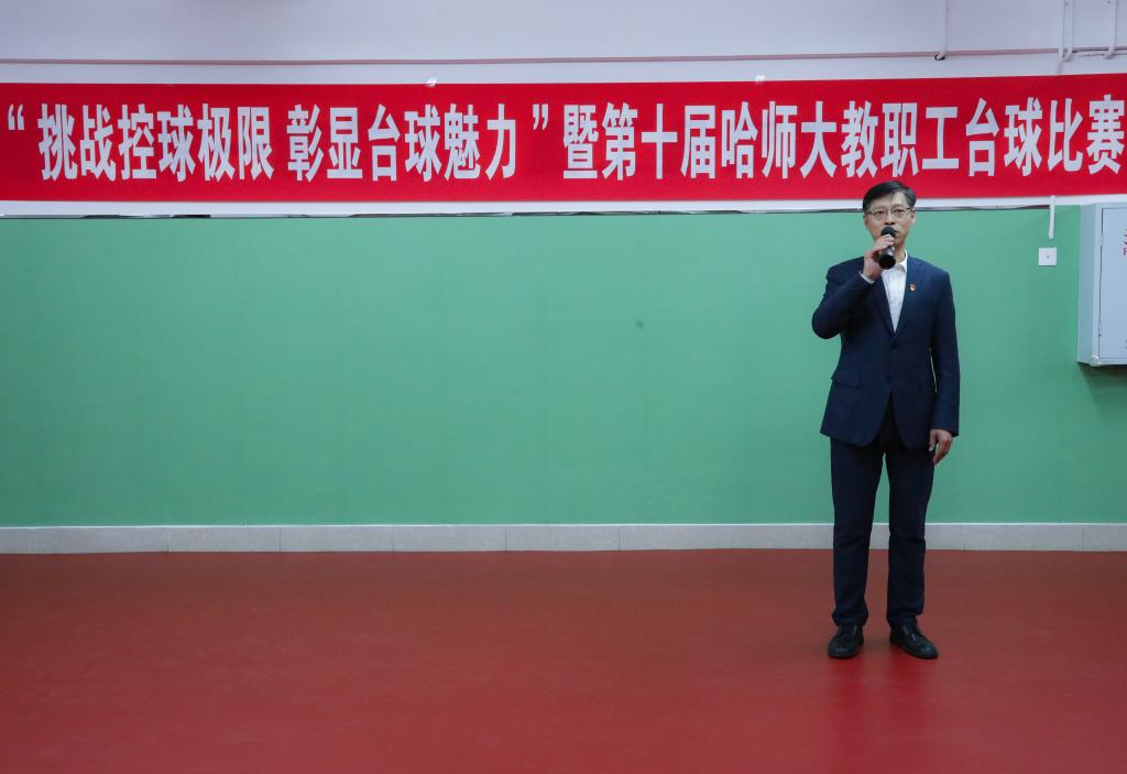 杨世君在讲话中首先向后勤管理处和体育科学学院给予本次比赛的大力支持表示感谢。他指出,这是三年新冠疫情以来的第一次大规模的教职工体育赛事,也是充分展现我校广大台球爱好者精湛球技和良好精神风貌的一次盛会。台球运动在我校有着广泛的群众基础,近年来,越来越多的教职工参与到这项运动中,并常年坚持练习,难能可贵。为进一步推广台球运动,校工会已经举办过九届台球比赛,并通过各种方式支持教职工台球协会开展活动,提升我校教职工台球竞技水平。