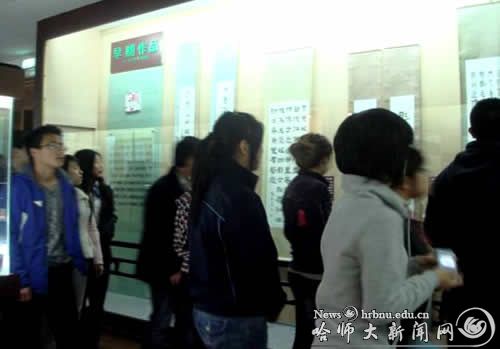 大家首先参观的是《邓散木艺术陈列》。大家对邓散木先生的书法、篆刻都极有兴趣,书法协会会长也不时地对作品作出讲解。随后在博物馆专业讲解员的带领下,学生们又来到了《黑龙江历史文物陈列》和《自然陈列》。伴随讲解员的解说,看着一件件历史文物,学生们了解到黑龙江地区人类历史上最具辉煌的史前文化、渤海文化和金源文化。最后在《自然陈列》中,学生们观赏到最具特色的展品:距今6500万年白垩纪晚期平头鸭嘴龙和距今2万年前的黑龙江第四纪披毛犀、猛犸象大型化石骨架,同时还看到了黑龙江省特有的珍惜动物标本。