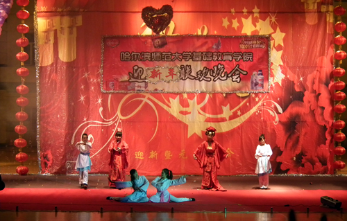 随着充满活力的音乐,由西语学院学生会成员带来的开场秀《向快乐出发》,拉开了本场晚会的帷幕。学院党委书记张艳君为晚会做新年致辞。本场晚会采用的是双语主持,体现时代的特色,晚会内容丰富,形式多样,歌曲类节目有时尚的歌曲串烧,激情的乐队演奏,颇具古韵的贵妃醉酒;舞蹈类节目有充满活力的现代舞,柔美的扇子舞,激情燃烧的拉丁;还有同学们自编自演的话剧《梦游法国》;小品、武术等丰富多样的节目,整场晚会观众们掌声不断,快乐的气氛环绕在同学之间。最后在一曲《难忘今宵》中,晚会圆满落下帷幕。