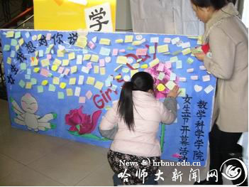 阳春三月,春意盎然。值此 “三八”国际妇女节来临之际,为丰富女学生的课余生活,树立女学生作为女性的自信心和自豪感,让更多的人关注女学生的健康成长,数学科学学院于3月8日早上在数学楼一楼大厅举办了“女生,我想对你说”祝福活动暨女生节开幕式。学生们以极高的热情积极地参加活动,用温馨诚挚的话语写下了一行行感人肺腑的祝福。