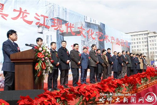 校党委书记在致辞中首先对省市领导以及相关部门领导的莅临表示热烈欢迎,对园区建设的大力支持表示感谢。随后,校党委书记介绍了文化艺术产业园区项目的总体概况、分期实施方案和定位,并向社会各界有识之士发出诚挚邀请,欢迎文化产业界的朋友、相关产业机构、企业、文化名人、专家学者到园区考察洽谈、共谋发展。最后党委书记表示学校将以园区项目为牵动,高标准、高水平规划建设重点文化惠民工程和重大产业项目,打造龙江一线文化品牌,推动龙江文化大发展大繁荣;同时学校将本着袖珍型、花园式、功能全、适宜人居、满足教学科研所需的理念和要求,进一步加强产学研一体化进程,推进江南校区的改造与升级,把江南校区打造成高水平的校区和高品位的文化艺术产业园区,为服务龙江经济社会发展做出卓越贡献!