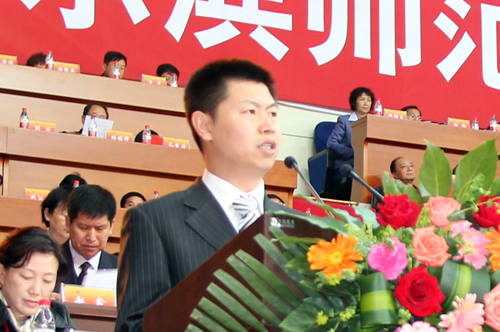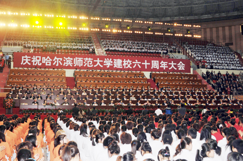 校长王选章在大会上讲话。他简要回顾了学校60年走过的光辉历程。他说,经过60年的发展,我校办学资源科学整合,办学结构日益优化,形成了师范性和非师范性齐头并进,基础学科和应用学科相得益彰的办学格局,学校走上了全面、协调、可持续的发展之路;人才培养质量稳步提高,教师队伍英才汇聚,实现了国家级教学团队、国家级人才培养模式创新实验区和国家级实验教学示范中心的重大突破;坚持开放办学,与20多个国家和地区的大学及科研机构加强交流合作,在海外创办了3所孔子学院;学科优势继续扩大,科研实力大幅提升,已经形成了由基础学科、新兴学科和特色优势学科构成的较完整的学科体系,初步完成了向综合性大学的转变;服务社会成就非凡,与经济社会同步发展,为社会培养和输送了30余万名优秀人才;党建和思想政治工作荣光不息,精神文明建设硕果盈枝,首创了“学、讲、研、用”四维一体的理论学习模式,率先在全省高校中启动了“青年马克思主义者培养工程”,先后获得“黑龙江省思想政治工作先进集体”、“省文明单位标兵”、“全国精神文明建设工作先进单位”等荣誉称号。他指出,哈师大将按照胡锦涛总书记在清华大学百年校庆大会上重要讲话精神,坚持以科学发展观为统领,认真贯彻落实国家教育发展规划纲要,坚持质量立校、人才强校、特色兴校的发展战略,重点建设艺术、教育、语言文化、自然科学和经济与管理特色优势学科板块,力争把我校建设成为卓越师资和精英人才的培养摇篮,创造活力迸发的创新基地;建设成为传承弘扬中华文化、推进知识创新的学术圣殿;建设成为服务经济与社会发展、引领社会进步的高水平教学研究型综合性大学。