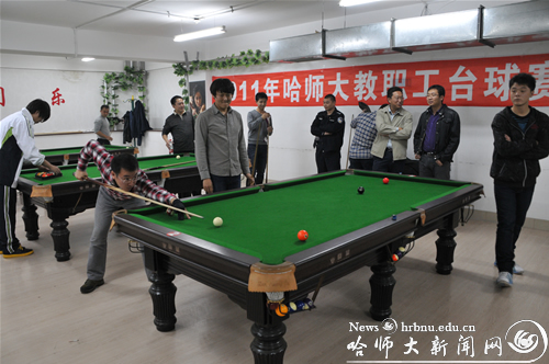 为丰富我校教职工的业余文化生活,我校2011年教职工台球比赛于10月10日至12日在江北校区教职工活动中心举行。本次比赛由校工会主办,教职工台球协会协办,共有80余名教职工参加了比赛,比赛得到了来自各基层工会的大力支持。