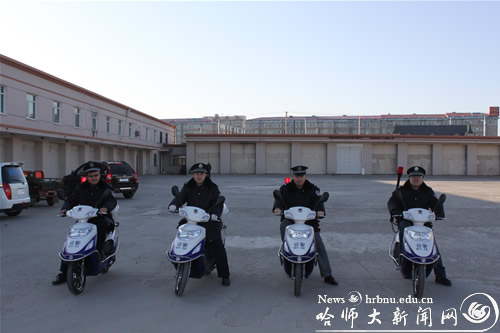 为进一步加强校园管控力度,提高保卫干警机动巡逻能力,在学校领导及地方公安机关的大力支持下,我校购置了四辆两轮电动巡逻车,并首先在江北校区投入使用。