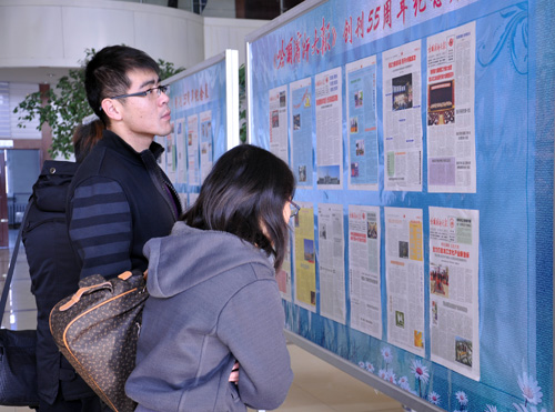 日前,为贯彻落实党的十七届六中全会精神,进一步加强校园文化建设,在第11个中国记者节来临之际,由党委宣传部主办的《哈尔滨师大报》创刊55周年纪念展在图书馆拉开序幕,为冬季的校园增添了一抹亮色。