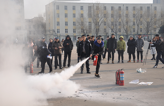 全体人员安全撤离公寓后,首先由保卫处同志现场讲解学生使用灭火器方法,工作人员点燃放置在场地中央的可燃材料模仿初级火灾现场,按照讲解方法学院师生进行实战灭火演练。