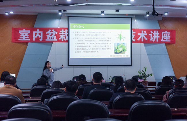 讲座中,吴姝菊以其深厚的植物学知识、丰富的花卉栽培经验,由浅入深,图文结合,生情并貌地对室内花卉养护的要诀、技巧、培育中存在的问题和注意事项等方面进行了讲解,并通过现场演示对如何处理好花草与光照、空气、温度的关系,及花卉常见病虫害的防治等日常管理知识进行了说明,纠正了大家日常生活中花卉养护的误区。同时,针对教职工们偏爱的多肉植物的栽培技巧也进行了详细讲解。