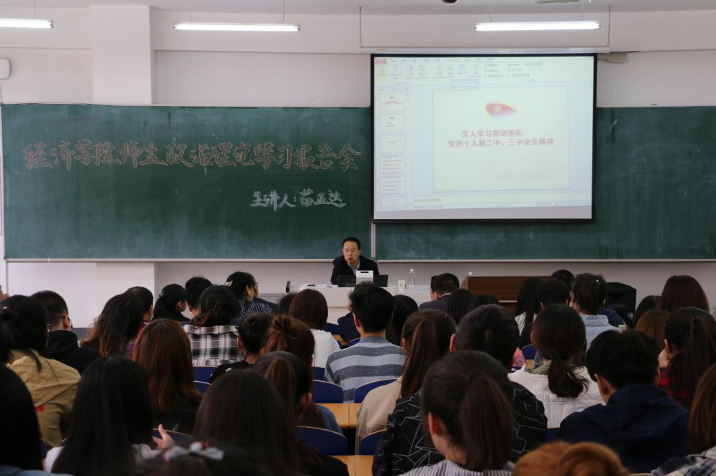 (刘恩权/文)4月18日下午,经济学院在崇师楼C201举办了政治理论学习报告会,会议邀请学校法律顾问、法学院院长苗正达教授做了学习贯彻十九届二中、三中全会精神专题辅导,学院全体教职工和部分学生党员、学生入党积极分子代表参加了报告会,报告会由学院党委书记王辉主持。