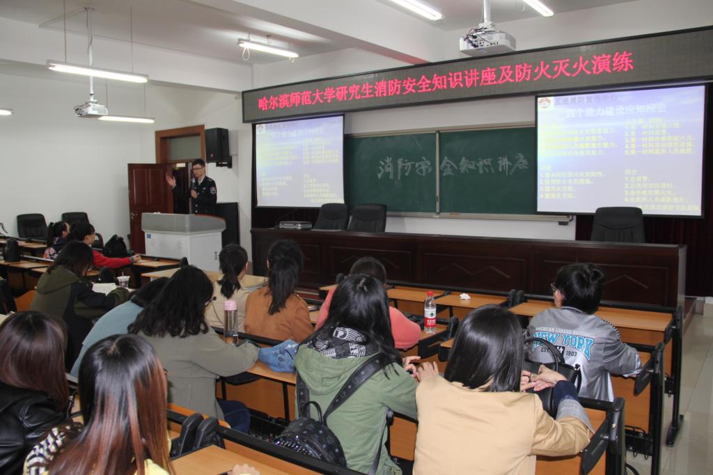 本次活动邀请了哈尔滨市五进消防知识培训中心张弘强教官。张教官培训内容涉及引发火灾火情的消防安全隐患、家庭电器设施设备正确使用方法、火情紧急情况处理、灭火器材种类和使用方法等,并用大量现实火灾事故案例警示每一位研究生提高自护、自救安全意识。讲座结束后,张教官和保卫处防火管理科同志组织了研究生火灾紧急情况疏散演练。