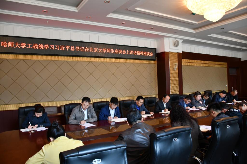 (仲微微/文)5月2日,习近平到北京大学考察,在与北大师生座谈时发表了重要讲话,讲话精神在哈师大学工战线中引起强烈反响并迅速掀起学习热潮。5月4日,学生工作部(学生处)于行知楼0107会议室组织召开了哈师大学工战线学习习近平在北京大学师生座谈会上重要讲话精神的座谈会,学生工作部(学生处)部(处)长姜玉洪,各学院党委副书记以及辅导员代表参加了座谈。会议由姜玉洪主持。