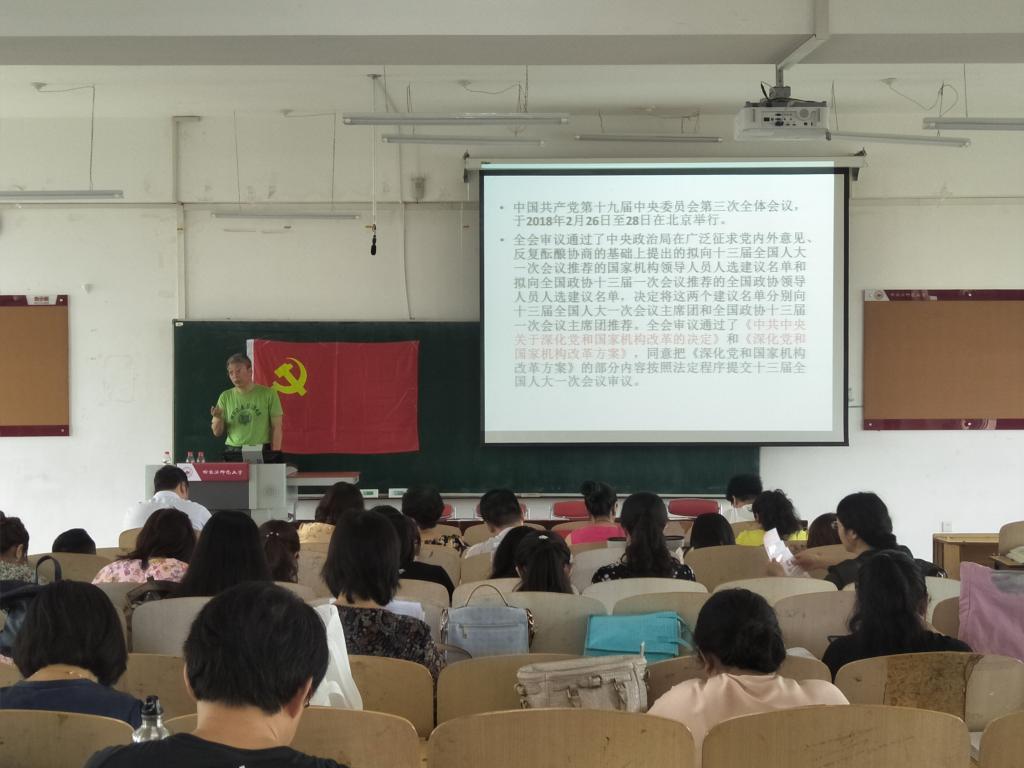 为落实学校党委《关于学习宣传贯彻党的十九届二中、三中全会精神的通知》,7月11日下午,西语学院党委邀请马克思主义学院翟志老师主讲题为《学习十九届二中三中全会精神 做合格党员》的辅导报告,学院全体教师参加,学院党委书记李贵彬主持报告会。