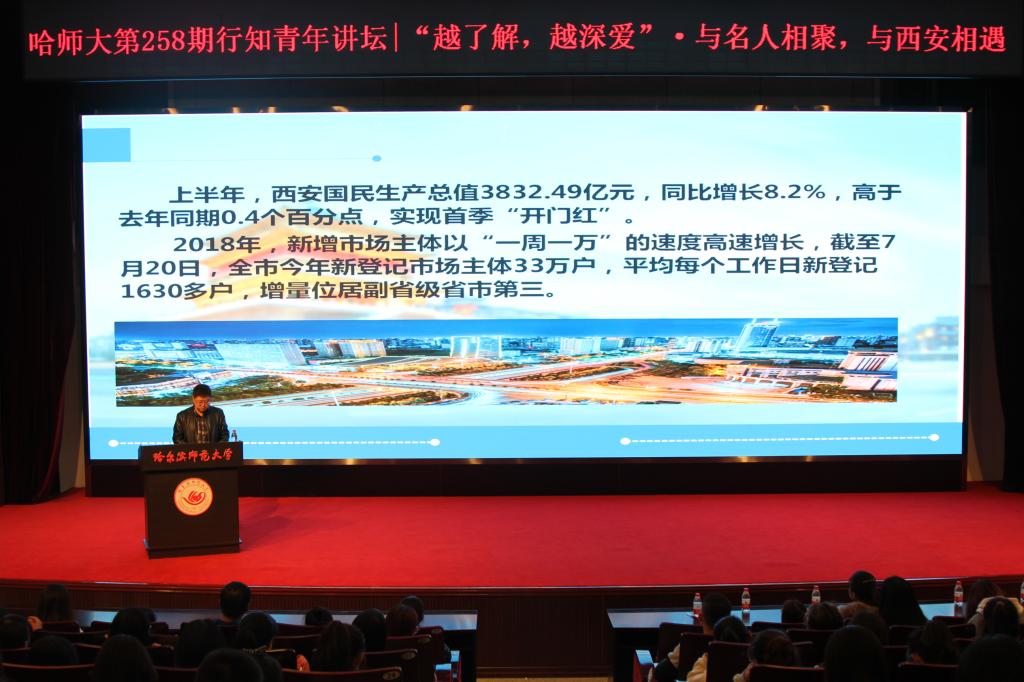 (刘强/文)10月24日,西安市科技局处长龚杰应邀做客我校第258期行知青年讲坛,讲座主题为“‘越了解,越深爱’——与名人相聚,与西安相遇”。本次活动在科学会堂二楼举行,现场座无虚席。