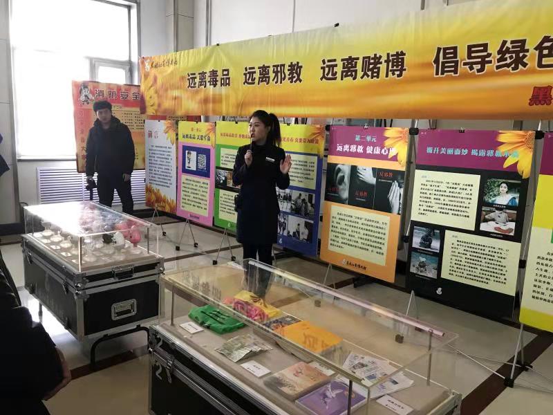 展会分为远离毒品、远离邪教、远离赌博、倡导绿色上网四部分内容。博物馆讲解员唐天骄对展出内容进行了详细讲解。