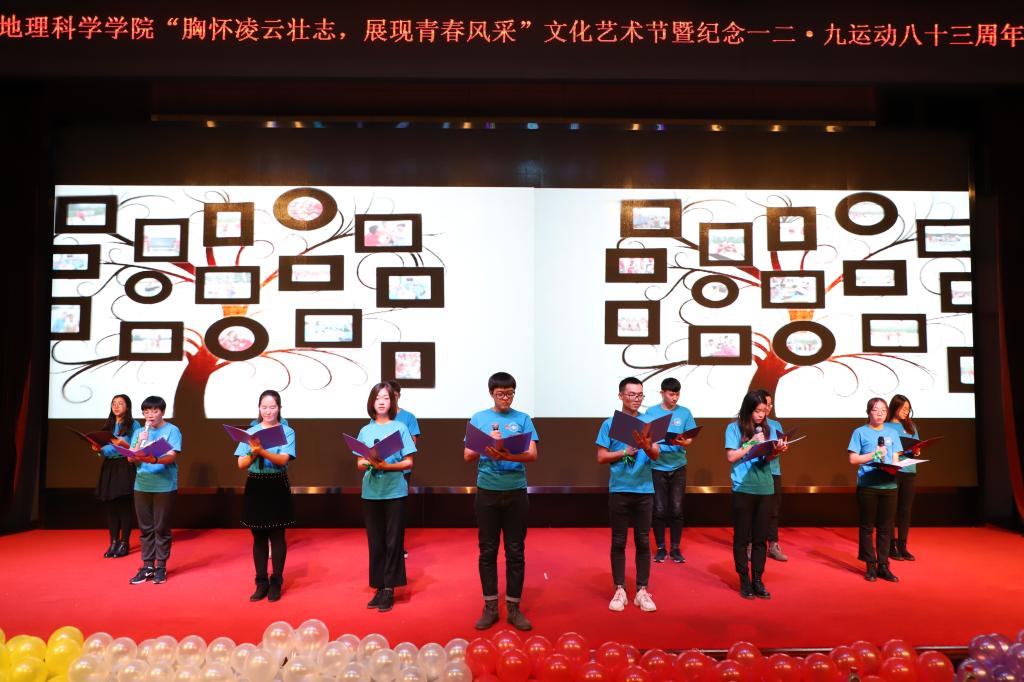 (陈莹莹/文)为深入学习贯彻习近平新时代中国特色社会主义思想和党的十九大精神,认真落实《拼搏在线登录大学生思想政治教育“112349”工作模式实施方案》,厚植爱国主义情怀,增强学生的责任感、使命感和集体荣誉感,展现青年学生积极向上、朝气蓬勃、奋发进取的精神风貌,12月6日晚,地理科学学院在科学会堂举行“胸怀凌云壮志,展现青春风采”校园文化艺术节暨纪念一二•九运动八十三周年文艺晚会。校团委副书记王若虎,地理科学学院党委书记蒙国军,党委副书记,正处级辅导员张立辉出席晚会。学院2017级,2018级全体同学参加晚会。