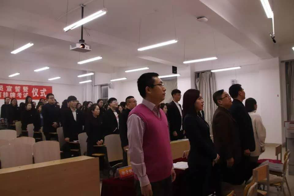 国歌声起,仪式开始。在辅导员老师领誓下,各新老党员郑重宣誓,以共产党员的标准严格要求自己,发挥先锋模范作用,为实现共产主义事业而奋斗,为党旗增辉,为母校添彩。随后,老党员代表泽表示欢迎新党员入驻,并阐明了党组织关系接转的流程和重要性。新党员代表张慧中也表达了自己对党员诚信挂牌考试的坚决拥护,并代表所有新党员郑重承诺,他们将会时刻以党员标准严格要求自己,在广大同学中切实发挥模范先锋作用。在《国际歌》的旋律声中,学院领导和辅导员老师为每位学生党员授予了诚信考试名牌,并由党员代表贾浩然宣读诚信考试倡议书。
