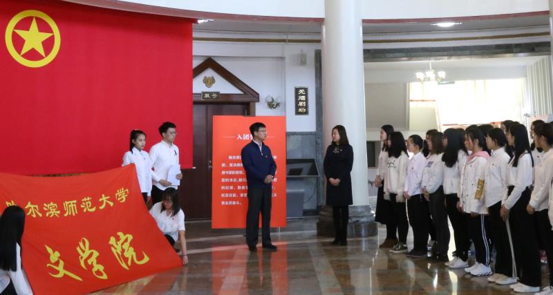 在馆内圆厅,青年团员们高唱团歌,展团旗,进行了新发展团员入团仪式。学院团委书记号召文学院青年应该自觉坚持党的领导,听党话、跟党走。认清当代中国青年运动的主题是为实现中华民族伟大复兴的中国梦而奋斗,必须把个人理想融入民族复兴伟大理想中。