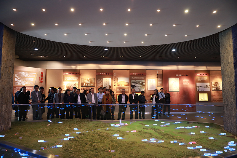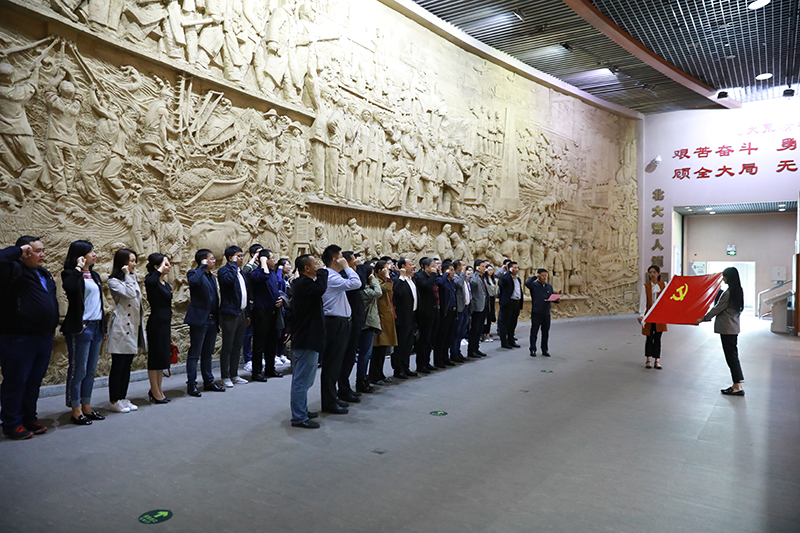参观结束后,全体党员佩戴党徽面向党旗在垦荒浮雕下重温入党誓词。