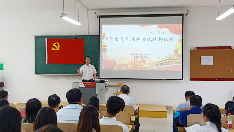 (程雨萱/文)为发挥党员先锋模范作用,传承诚信优良品质,7月1日下午,物理与电子学院在理工二号楼211教室举行学生党员挂牌考试授牌仪式。学院党委书记刘旭繁、院长高红、副院长孙文军以及师生全体党员参加了活动,活动由学院党委副书记姜雪娥主持。