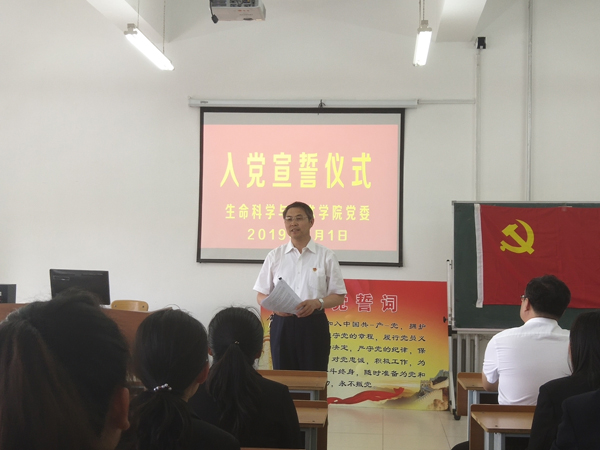 7月1日,学院党委在理工三号楼323室举行2019年上半年接收预备党员入党宣誓仪式,部分入党积极分子参加活动。党委书记于占福、党支部书记陈瑛、杨冬鹤、刘祎男、任广悦等为34名预备党员佩戴党员徽章,在高阳领誓下,全体新老党员面对鲜红的党旗,举起右拳,庄严宣誓。本科生姜琳同学代表全体新党员发言,为能加入这个伟大、光荣、温暖的大家庭而感到自豪,今后将会更加严格要求自己,为党奉献出青春和热血。研究生党支部书记任广悦代表老党员发言表示,作为一名当代研究生,要爱党,敬党,跟党走。学校给我们提供了展示自我,实现人生价值的舞台,我们唯有敏思好学,爱岗敬业,才对得起党,对得起自己的学业。
