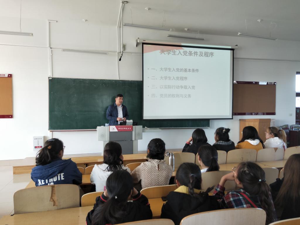 李贵彬主讲的题目是《大学生入党的程序和条件》,主要分为申请入党的条件、大学入党的程序和实际行动争取入党等三部分内容。他从《中国共产党章程》中申请入党的条件导入,详细解读了入党的年龄要求、思想要求、纪律要求等条件,并从思想、学习、工作和群众基础四个方面介绍我校发展党员的具体条件。李贵彬在发展入党程序部分强调了严格入党程序的重要意义,从入党积极分子的培养、预备党员接收及预备党员转正等阶段程序和要求逐一进行介绍,重点解读了如何申请入党、入党申请书写法、确定积极分子程序及标准、党校培训、推优测评等新生将面临的申请培养问题。在实际行动争取入党部分,李书记谈到了端正入党动机、正确认识党员标准、主动接受组织考察、以实际行动争取入党等要求。最后,他代表学院党委向2019级新生提出了坚定信仰、勇担责任、早树目标、学好理论、刻苦学习的期望。