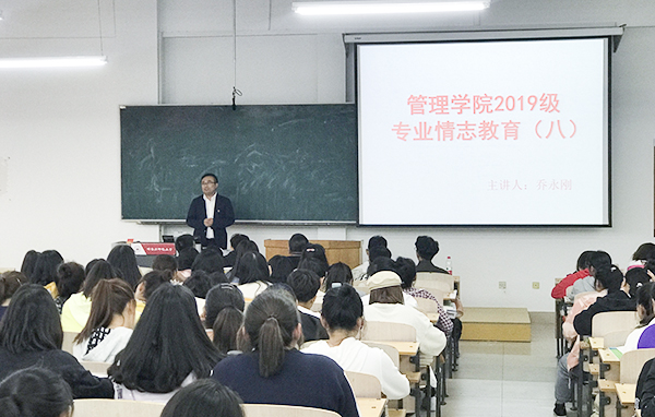 (陈凤/文)为了帮助2019级新生尽快适应大学生活,增强专业认可度,提升学生专业能力和素养,管理学院于9月27日在人文楼212、127室举办了2019级第八场专业情志教育。管理学院党委副书记乔永刚主讲,2019级全体学生参加了本场讲座。