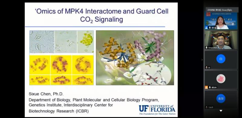 8月25日,通过腾讯会议平台陈教授为师生作了题为“Omics of MPK4 interactome and Guard Cell CO2 Signaling”的学术报告,学院相关教师和研究生聆听了此次报告,中国农业大学、上海师范大学、东北林业大学、东北农业大学、黑龙江大学等单位的专家与研究生也听取了报告。报告中陈教授介绍了利用基因工程和蛋白质组学手段相结合的方式研究丝裂原活化激酶4(MPK4)参与调节植物防御的信号网络的实验系统,通过这个实验系统鉴定出可能的MPK4底物,证明了磷酸蛋白组学在阐明激酶动力学和鉴定激酶底物方面的实用性。同时陈教授介绍了联用代谢组学研究二氧化碳信号转导,并发现一种新信号传导途径方面的工作。在交流互动环节,陈教授与参会师生就如何利用多组学联动开拓新的研究方向进行了热烈的讨论,为相关研究提供了新的思路。