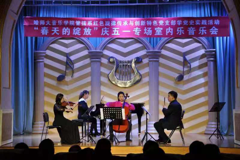 为了庆祝建党100周年,音乐学院党委组织各支部开展“乐学党史·支部力行”主题党日及专业实践活动。4月25日晚,管弦系红色旋律传承与创新特色党支部在哈尔滨市工人文化宫音乐厅举办了《春天的绽放》室内乐专场音乐会。