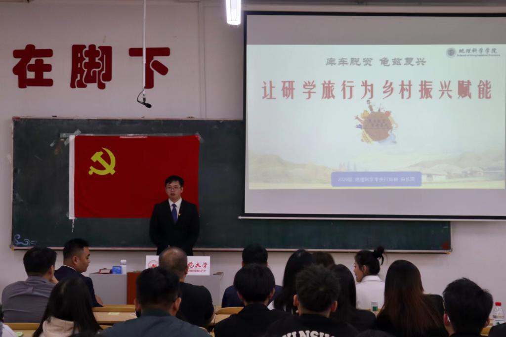(宋歌/文)为深入学习贯彻习近平新时代中国特色社会主义思想,推动我校主题教育高质量开展的同时,推动学院主题教育有力有序走深走实,更深更细延伸到全体师生党员,有序推进学生党员讲党课,落实“学思想、强党性、重实践、建新功”的总要求,实现坚持学思用贯通、知信行统一的根本任务。地理科学学院于5月10日下午,在理工三号楼220室举办学习贯彻习近平新时代中国特色社会主义思想主题教育——“党建引领助力乡村振兴,党员先行汇聚青春力量”学生党员讲党课特色主题党日活动。本次活动由地理科学学院学生工作办主任、地信研究生第一党支部书记宋歌主持,连续两次国家奖学金获得者2020级本科生田乐同主讲。地理科学学院党委书记张立辉、党委副书记陈莹莹、部分辅导员及全体学生党员参加本次活动。