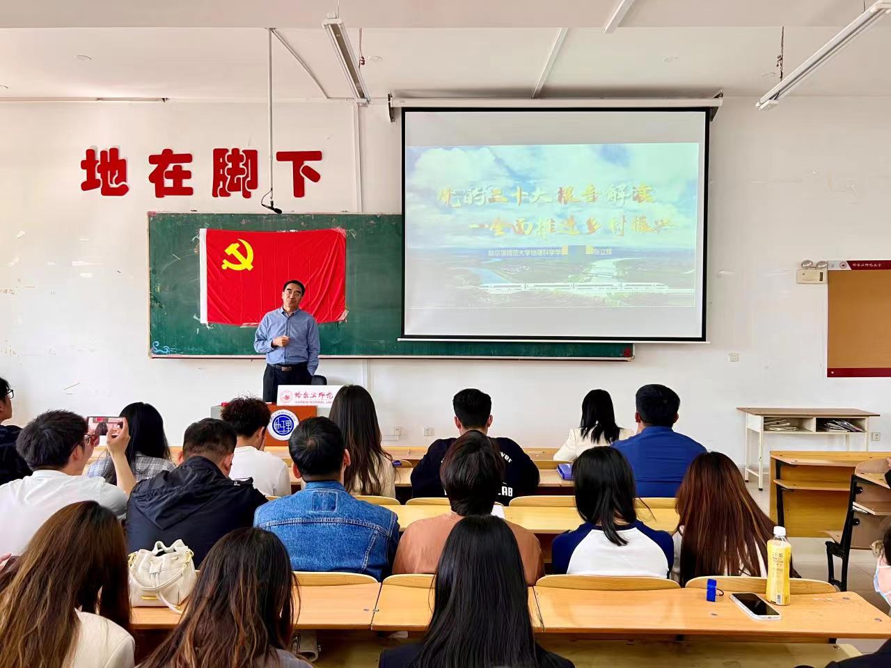 (宋歌/文)为深入学习贯彻习近平新时代中国特色社会主义思想,深刻领会党的二十大报告中“全面推进乡村振兴”的重要讲话精神,推动学院主题教育工作高质量开展,紧扣“六个龙江”“八个振兴”目标任务,全面助力乡村振兴。地理科学学院于5月17日下午在理工三号楼220室举办学习贯彻习近平新时代中国特色社会主义思想主题教育——“党的二十大报告解读之全面推进乡村振兴”特色主题党日活动。本次活动由地理科学学院学生工作办主任、地信研究生第一党支部书记宋歌主持,地理科学学院党委书记张立辉主讲。学院党委副书记陈莹莹、副院长周嘉,部分辅导员及全体学生党员参加本次活动。