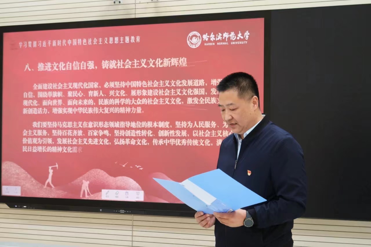 活动第一项“学原文——共学一本书籍”。全体党员集中学习《党的二十大报告》第八部分:推进文化自信自强,铸就社会主义文化新辉煌,学院党委副书记吕红伟以普通党员身份参与活动并领读。在场同志通过读原文、学原著、悟原理,进一步将思想和行动统一到党的二十大报告精神上来,自觉肩负起新时代赋予的历史使命和责任担当。