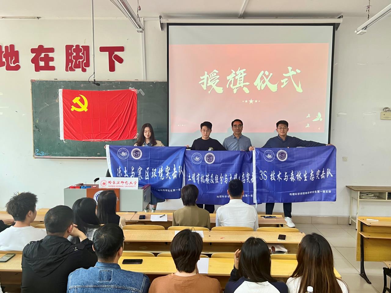 (宋歌/文)为深入学习贯彻习近平新时代中国特色社会主义思想,落实“学思想、强党性、重实践、建新功”的总要求,充分扩大学院主题教育的延伸面和辐射面,把学习领悟主题教育思想与扎根中国大地、锻造复兴栋梁相结合。地理科学学院于5月24日下午在理工三号楼220室举办“党建促科研发展,科研助乡村振兴”主题教育党日活动暨地理科学学院科研突击队授旗仪式。本次活动由地理科学学院学生工作办主任、地信研究生第一党支部书记宋歌主持。学院党委书记张立辉、副书记陈莹莹、副院长周嘉、辅导员及全体学生党员参会。