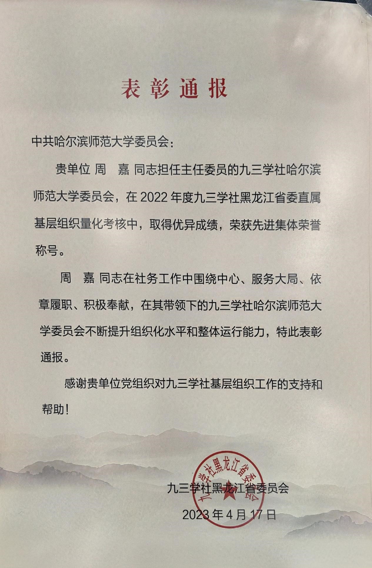 (周宏璐/文)近日,九三学社黑龙江省委通报对42个省直属基层组织量化考核结果,九三学社拼搏在线登录委员会取得量化考核排名第三的优异成绩,荣获九三学社黑龙江省委授予的“先进集体”荣誉称号。