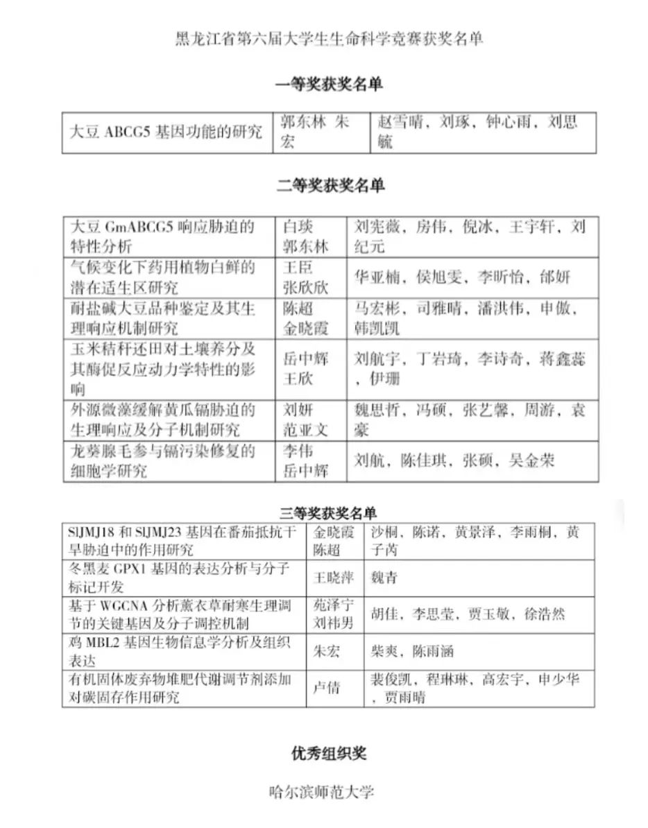 (郭东林/文) 7月28日至29日,在齐齐哈尔大学的举办“第八届全国大学生生命科学竞赛(科学探究类)黑龙江赛区决赛暨第六届黑龙江省大学生生命科学竞赛”中,我校生命科学与技术学院师生获得一等奖1项,二等奖6项,三等奖5项,我校获得优秀组织奖。