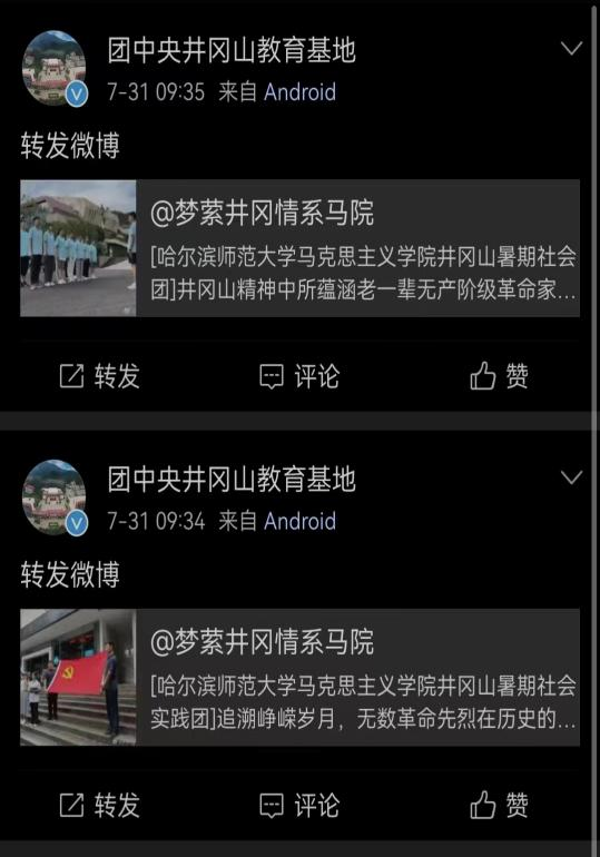 实践团及时将社会实践所获得的感性认知转化为理论宣讲的动力之源。团队成员充分学习领会井冈山精神的深刻内涵,以马克思主义学院“学讲研用”特色宣讲模式为基底,不断完善和丰富实践项目,将井冈山精神的深刻内涵充分运用到理论宣讲中。团队成员不断扩大理论宣讲的覆盖面,“用”好井冈山精神,丰富宣讲资源。实践团在新媒体宣传方面成果显著,截止至2023年8月2日,抖音短视频平台发布视频均获得3000+的浏览量,获得团中央井冈山教育基地的点赞;在新浪微博平台进行成果展示与理论分享,篇均浏览量500+且获得团中央井冈山教育基地的转发;在《人民日报》视频平台《视界》“2023年大学生暑期实践季”专题中,三个视频被纳入精选视频行列。