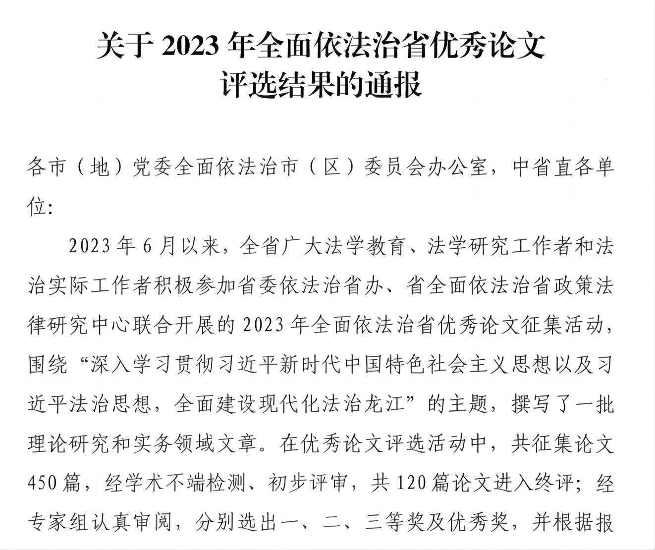 近日,中共黑龙江省委全面依法治省委员会通报2023年全面依法治省优秀论文评选结果,我校师生参选论文获奖。其中,2篇荣获三等奖,1篇论文荣获优秀奖。