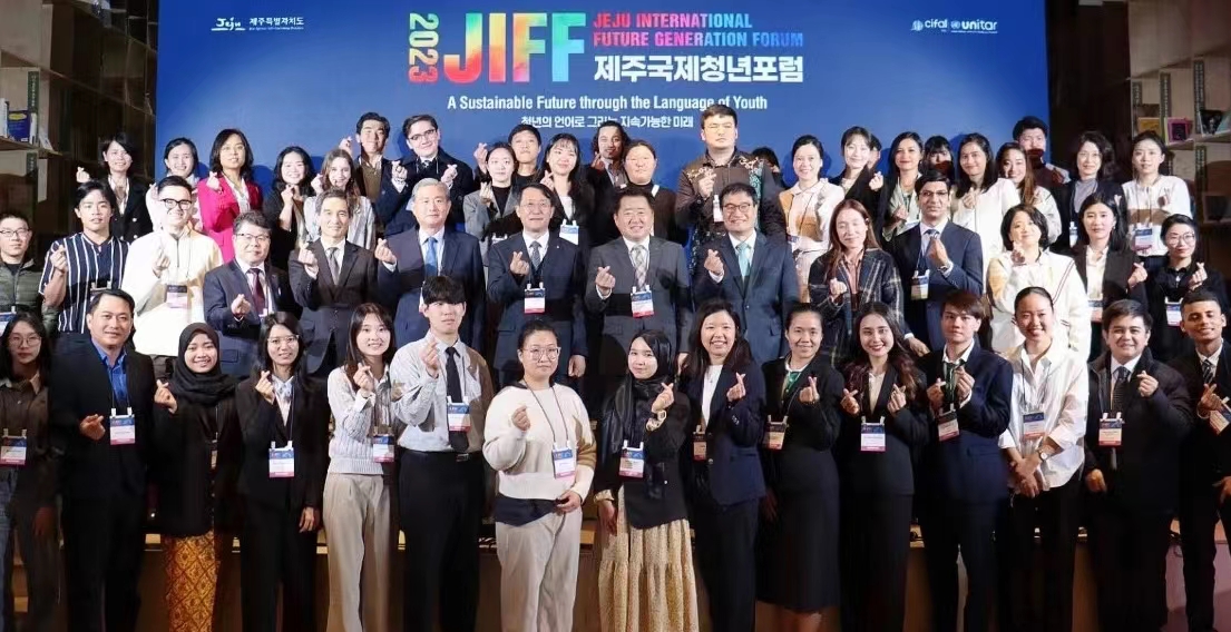 (周紫荆/文)11月24日至26日,由韩国济州特别自治道主办,联合国训练研究所(UNITAR)、济州国际培训中心协办的“2023济州国际青年论坛”在韩国济州岛举办,中国驻济州总领事王鲁新,韩国济州道知事吴怜勋、济州大学校长金一焕出席论坛并致辞。活动邀请了中国、韩国等13个国家、25个城市60余名青年代表现场参会。受主办方邀请、黑龙江省人民政府外事办公室委托,我校团委书记刘春玲、西语学院博士研究生周紫荆代表黑龙江省赴韩国参加“2023济州国际青年论坛”。
