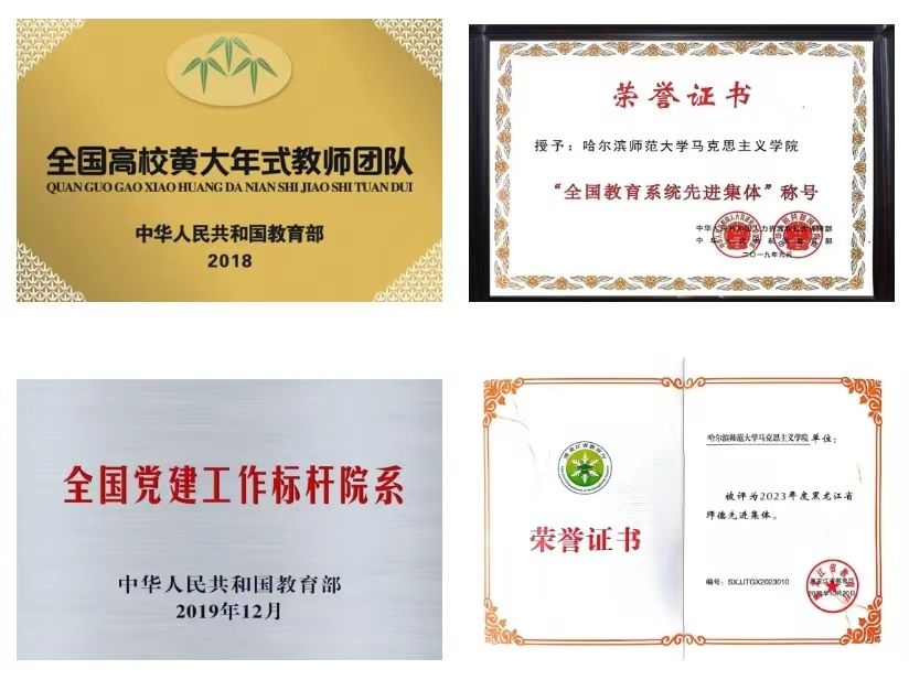 学院思政课教师团队是首批全国高校黄大年式教师团队。近五年,学院获评全国重点马克思主义学院、全国教育系统先进集体、全国高校思政课“手拉手”集体备课中心、黑龙江省师德先进集体。学院党委获批全国党建工作标杆院系、黑龙江省基层党建示范点,荣获黑龙江省“先进基层党组织”等荣誉称号,3个教师党支部获批全国党建工作样板支部,1名教师在全省高校党支部书记素质能力大赛中荣获一等奖。教师团队中有全国优秀教师、教育部新世纪人才、教育部思政课教学能手、全国思政课教师年度影响力人物、全国最美高校辅导员、教育部及省思政课教指委委员等中坚骨干力量,多名教师获国务院及省政府特殊津贴、省教学名师、省师德先进个人等荣誉。团队教师有授业情怀、对教育事业投入真情实感,立足龙江热土倾心铸魂育人。